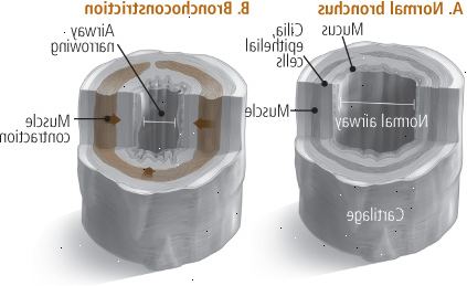 V normálním průdušky (A), svaly jsou uvolněné tak, že vzduch prochází snadno dýchacích cest. Ale u astmatu, bronchiální svaly může smlouvu nadměrně (B), často v reakci na alergen, nebo nějaké jiné astmatu spoušť. Zánět