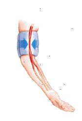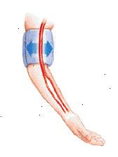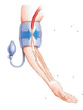 Manžeta je nafouknuta kolem paže stručně omezit průtok krve. Stetoskop je umístěn mezi manžetou a paží.